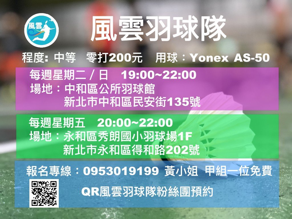 [台北縣中永和]風雲羽球隊每周二、日19:00~22:00, 五19:00~21:00