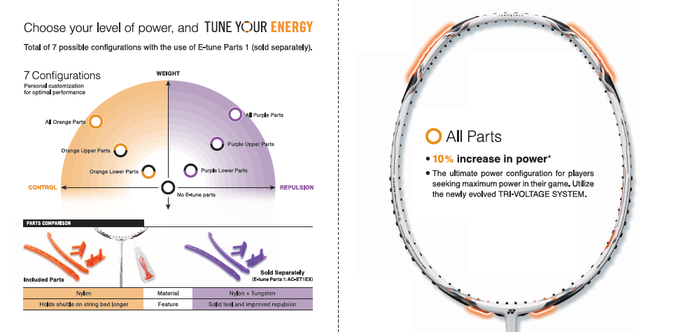 Orange = player can fully customize their level of power by distributing weight where they want, hold shuttle on string bed longer 簡單的說橘色的連釘就是增加重量, 來增加頭重的借力, Purple= solid feel and improve repultion而紫色的連釘材質比較硬, 減少線的咬球, 增加快速反彈的效果..... 我認為這和穿線者的功力沒有關係.... 反而是說不需要這些連釘, 穿線者就應該可以依照使用者的習慣來調整拍床的效果了....