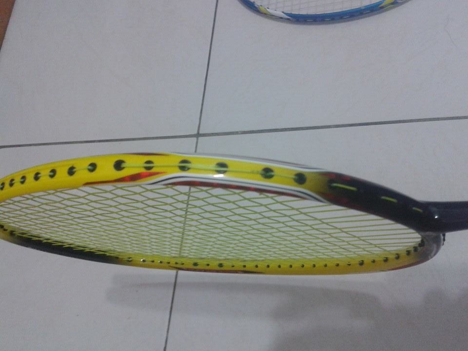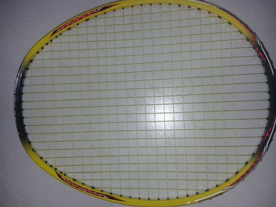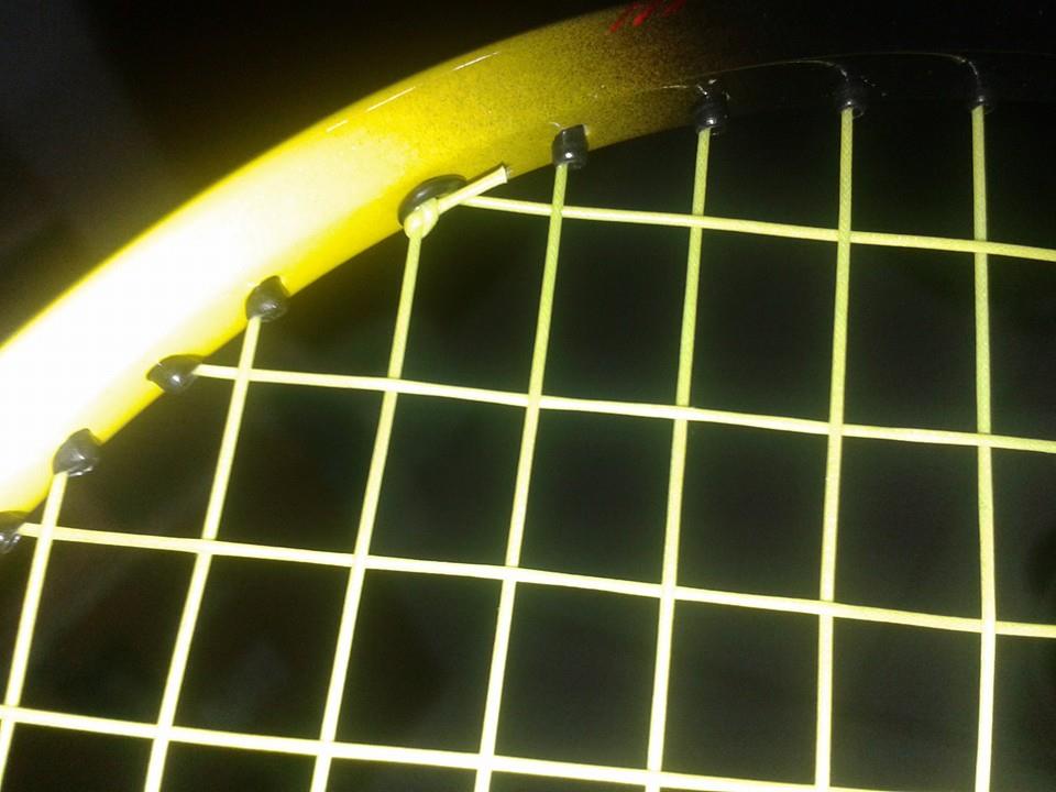 最頂上加一條橫線能夠抑制拍頂上的所謂剪刀孔的不慎誤擊到框邊把線『剪』斷!但是通常最上面多拉的線沒有可以夾線的空間,所以就只有走回線後加磅一次拉兩條了!拉完後這條多拉的線會卡緊在拍頭的分壓墊上,所以取拍下架時,通常我會連同分壓墊一起從12點的L柱上取下來在取出分壓墊。下面就是我今天剛幫同事拉的NS9900 Zymax 70 32/33P,因為高磅,所以幫他在拍頂上多拉一條橫線來防誤擊斷線。Chien 寫:謝謝梁教授,原來如此,我懂了,不過,這有好處嗎?